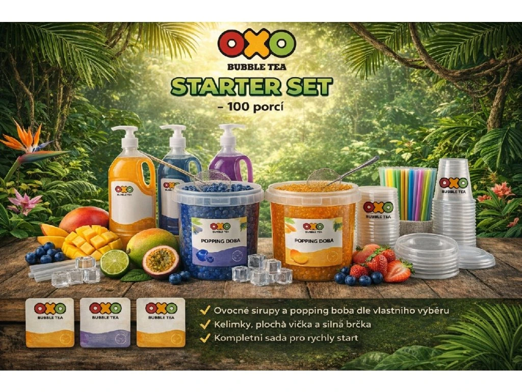 Komplettes OXO Bubble Tea STARTER SET für die Zubereitung von 100 Portionen – ein flexibles Set, ideal für einen schnellen Start mit Bubble Tea. Es enthält Fruchtsirupe und Popping Boba nach eigener Wahl, komplettes Zubehör einschließlich Becher, Deckel, Strohhalme und praktischer Schöpfkellen. Das perfekte Starterpaket für Betriebe, die ihren Kunden erfrischende, farbenfrohe und attraktive Bubble Tea-Getränke mit der Möglichkeit zur Anpassung des eigenen Angebots anbieten möchten.