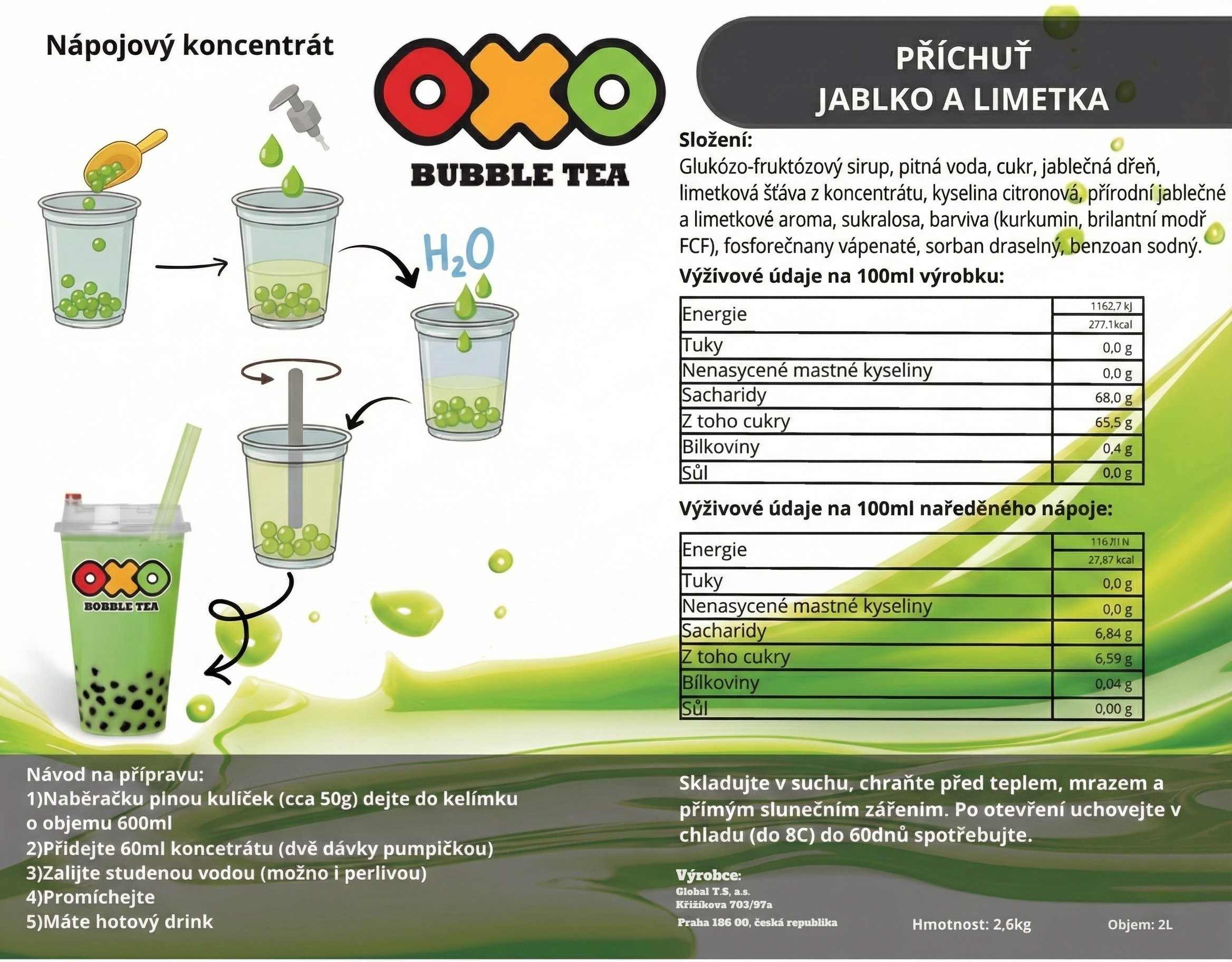 OXO Čajový Koncentrát Jablko – Limetka Maximální osvěžení v každém doušku. Tento koncentrát spojuje šťavnatou chuť křupavého zeleného jablka s výraznými citrusovými tóny limetky. Je perfektním základem pro kyselkavé Bubble Tea, letní limonády nebo nealko koktejly. Z jednoho 2litrového balení připravíte 40–55 porcí, což zaručuje skvělou výtěžnost. Praktická pumpička pro čisté dávkování je součástí balení.
